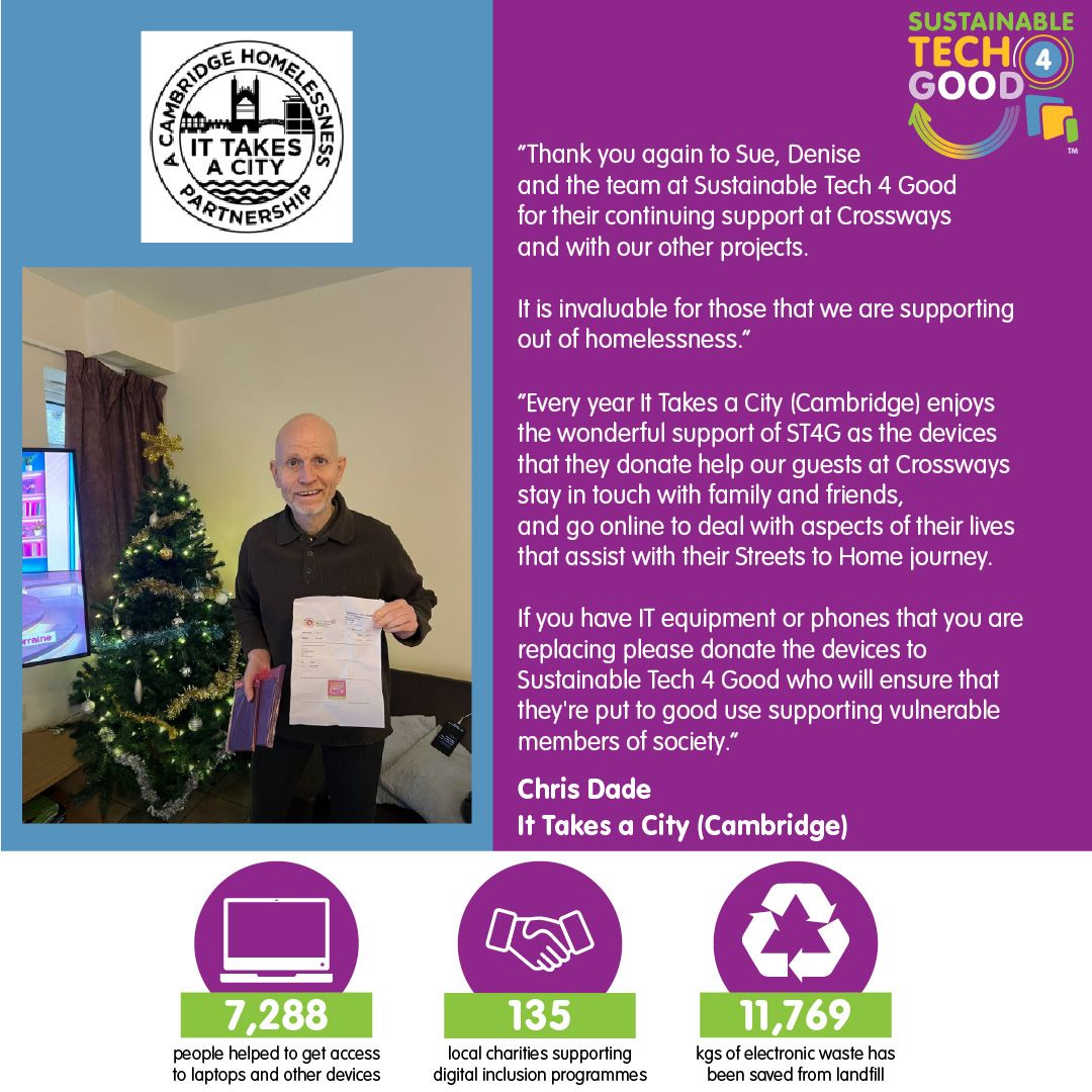 Every year It Takes A City (Cambridge) enjoys the wonderful support of ST4G as the devices that they donate help our guests at Crossways, stay in touch with family and friends, and go online to deal with aspects of their lives that assist with their Streest to Home journey.